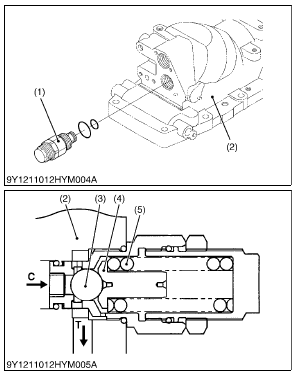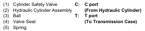 compress the spring (5). The oil in the hydraulic cylinder flows to transmission case through the T port.
