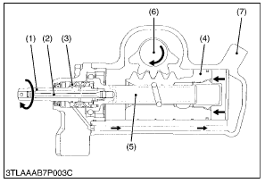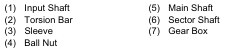 The operating principle is the same as with the left turn. For the right turn, however, the gap between the input shaft (1) and sleeve (3) is in the direction opposite to that of left turn. By so doing, the cylinder’s chamber “b” comes under high pressure and the ball nut (4) is moved to the left. Finally the sector shaft (6) gets turned to turn the machine to the right.