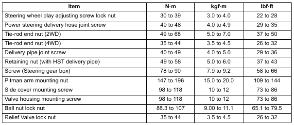 Posted on December 9, 2021 Home » KUBOTA » L2501 » KUBOTA – L2501 – STEERING – TIGHTENING TORQUES KUBOTA – L2501 – STEERING – TIGHTENING TORQUES Tightening torques of screws, bolts and nuts on the table below are especially specified. Related Posts KUBOTA - L2501 - BRAKES - TIGHTENING TORQUESTightening torques of screws, bolts and nuts on the table below are especially specified. (For… KUBOTA - L2501 - FRONT AXLE - TIGHTENING TORQUESTightening torques of screws, bolts and nuts on the table below are especially specified. KUBOTA - L2501 - REAR AXLE - TIGHTENING TORQUESTightening torques of screws, bolts and nuts on the table below are especially specified. (For… KUBOTA - L2501 - STEERING - TROUBLESHOOTING KUBOTA - L2501 - STEERING - STRUCTUREThe integral type power steering is used on this tractor. This steering system is composed…