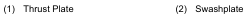 2. If the thrust plate (1) and the swashplate (2) are worn and scored, replace them.