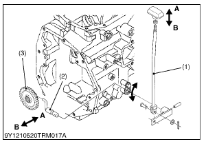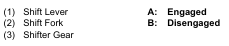 When the shift lever (1) is moved to the “A” side, the shift fork (2) is also moved to the “A” side, then the front
